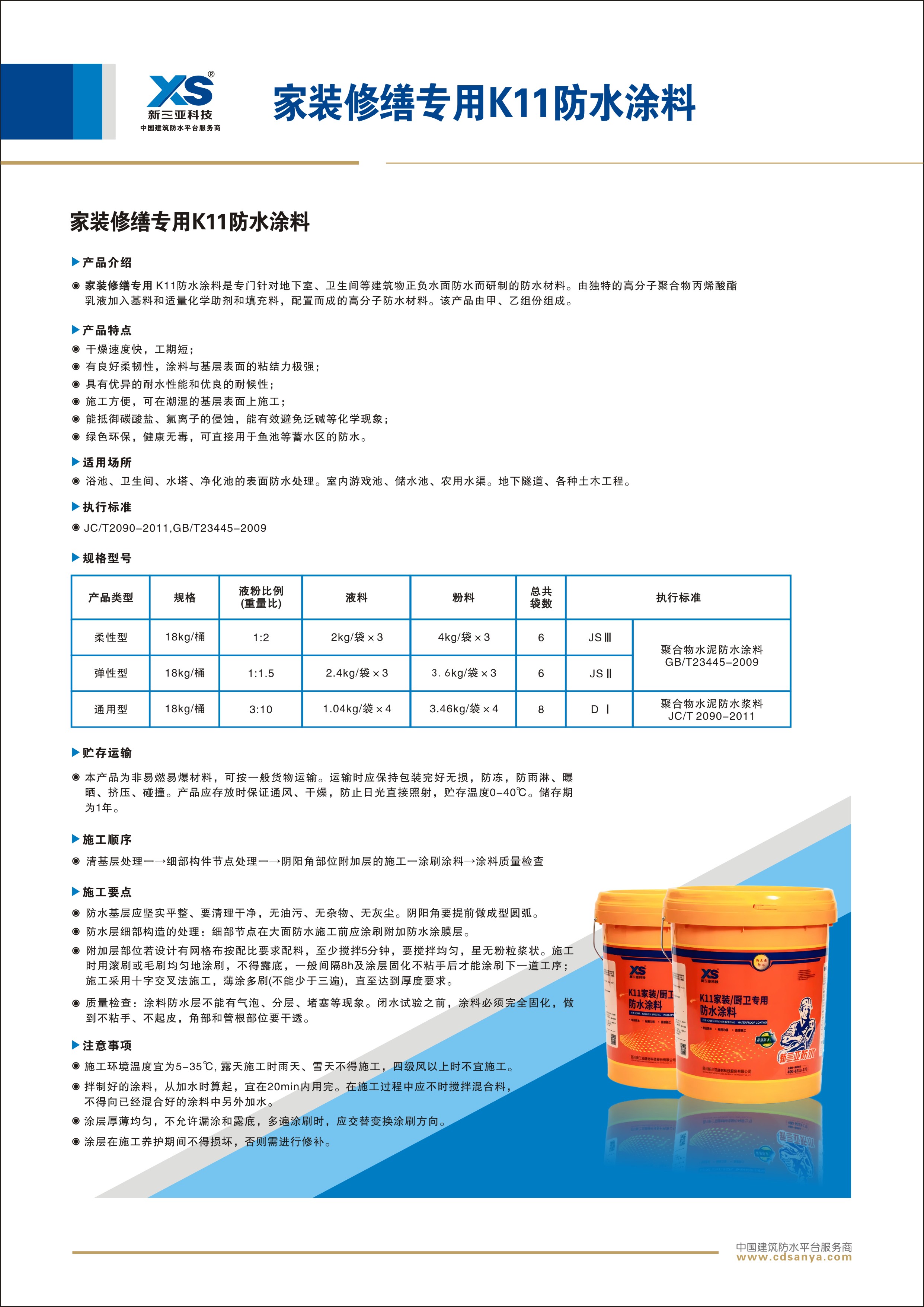 產(chǎn)品簡介: 家裝修繕專用K11防水涂料是專門針對地下室、衛(wèi)生間等建筑物正負水面防水而研制的防水材料。由獨特的高分子聚合物丙烯酸酯乳液加入基料和適量化學助劑和填充料,配置而成的高分子防水材料。該產(chǎn)品由甲、乙組份組成。 規(guī)格:18kg/桶 | ![]() |