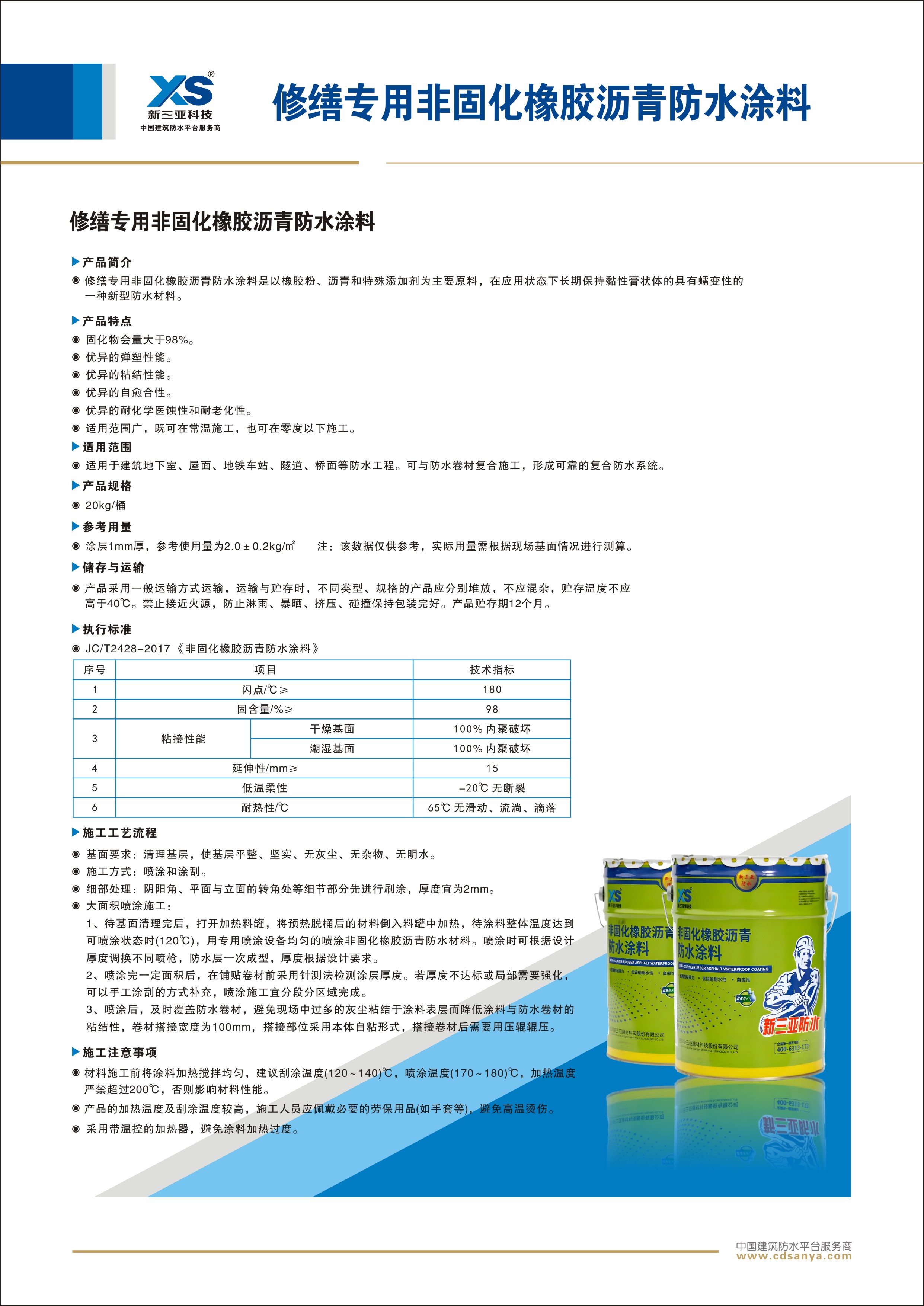 產(chǎn)品簡(jiǎn)介: 修繕專用非固化橡膠瀝青防水涂料是以橡膠粉、瀝青和特殊添加劑為主要原料,在應(yīng)用狀態(tài)下長(zhǎng)期保持黏性膏狀體的具有蠕變性的一種新型防水材料。 規(guī)格:20kg/桶 | ![]() |