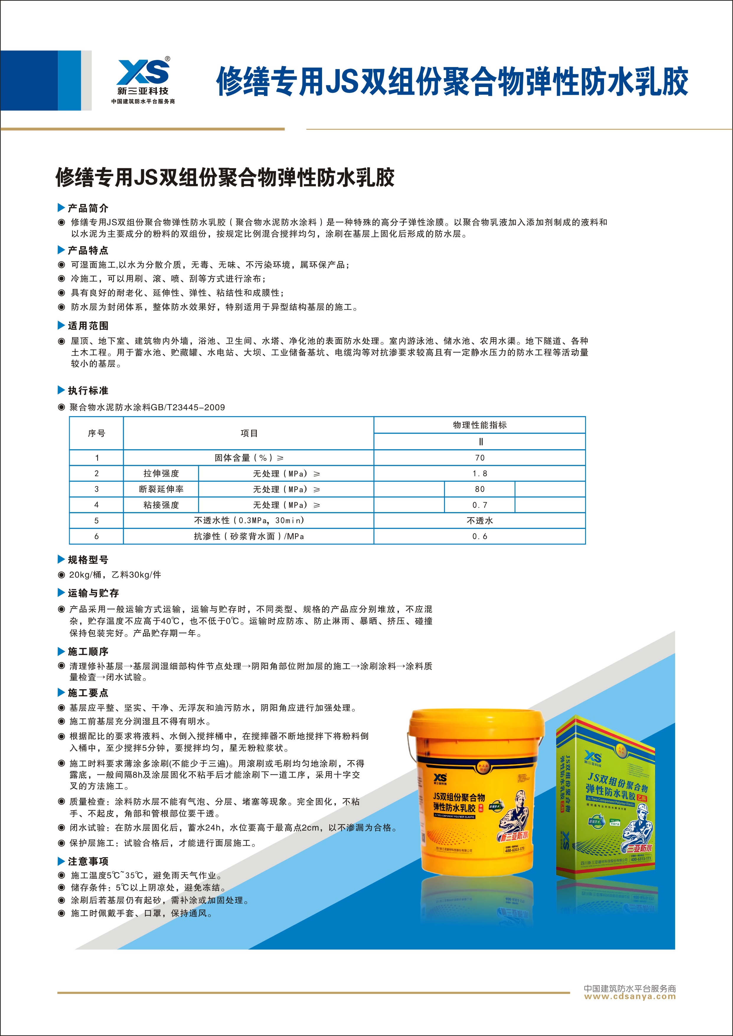 產(chǎn)品簡(jiǎn)介: 修繕專(zhuān)用JS雙組份聚合物彈性防水乳膠是一種特殊的高分子彈性涂膜。以聚合物乳液加入添加劑制成的液料和以水泥為主要成分的粉料的雙組份,按規(guī)定比例混合攪拌均勻,涂刷在基層上固化后形成的防水層。該產(chǎn)品由甲、乙組份組成。 規(guī)格:J甲料20kg/桶,乙料30kg/件 | ![]() |
