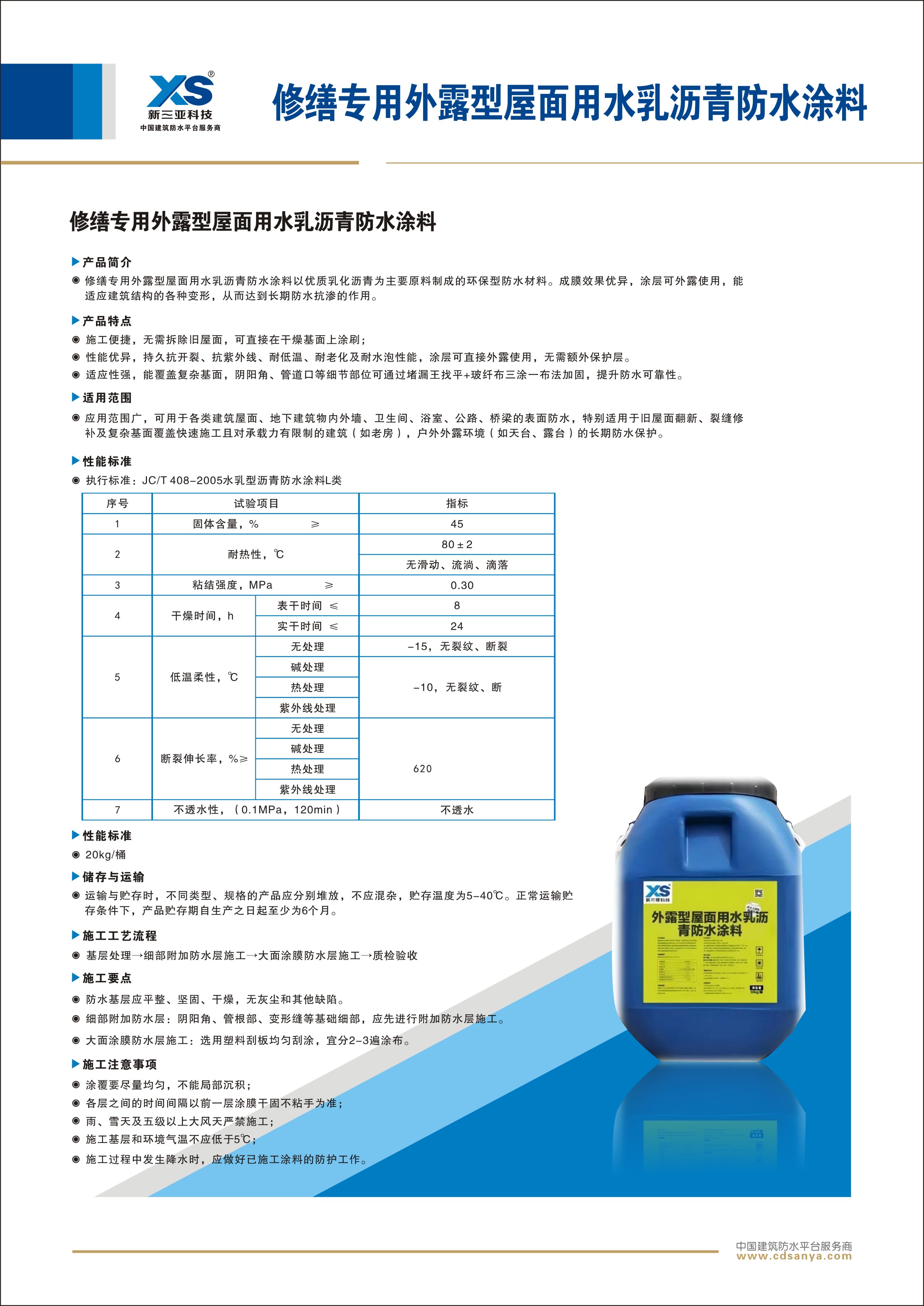 產(chǎn)品簡介: 修繕專用外露屋面用水乳瀝青防水涂料是以優(yōu)質(zhì)乳化瀝青為主要原料制成的環(huán)保型防水材料。成膜效果優(yōu)異,涂層可外露使用,能適應(yīng)建筑結(jié)構(gòu)的各種變形,從而達(dá)到長期防水抗?jié)B的作用。 規(guī)格:50kg/桶 | ![]() |
